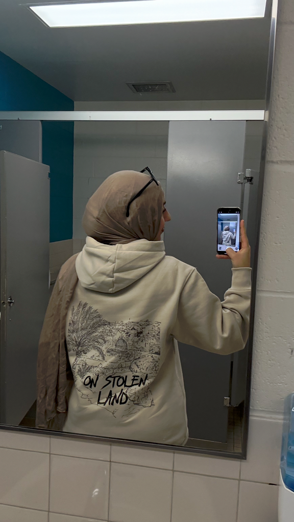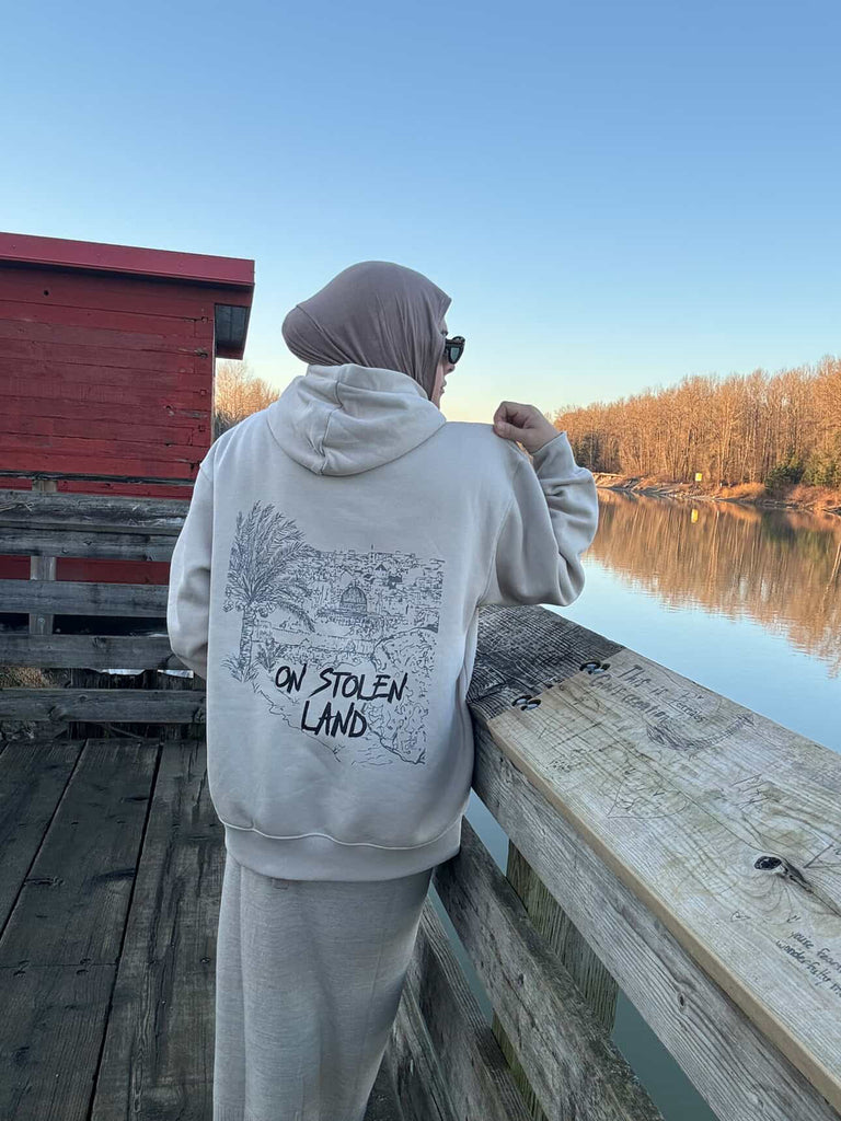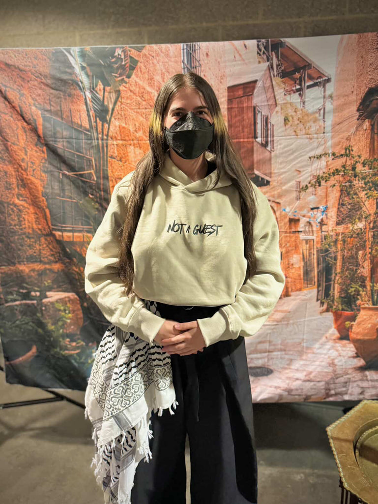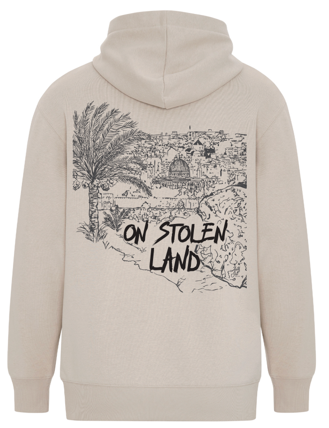 This hoodie features “Not a Guest” on the front and an illustrated Jerusalem cityscape with “On Stolen Land” on the back.